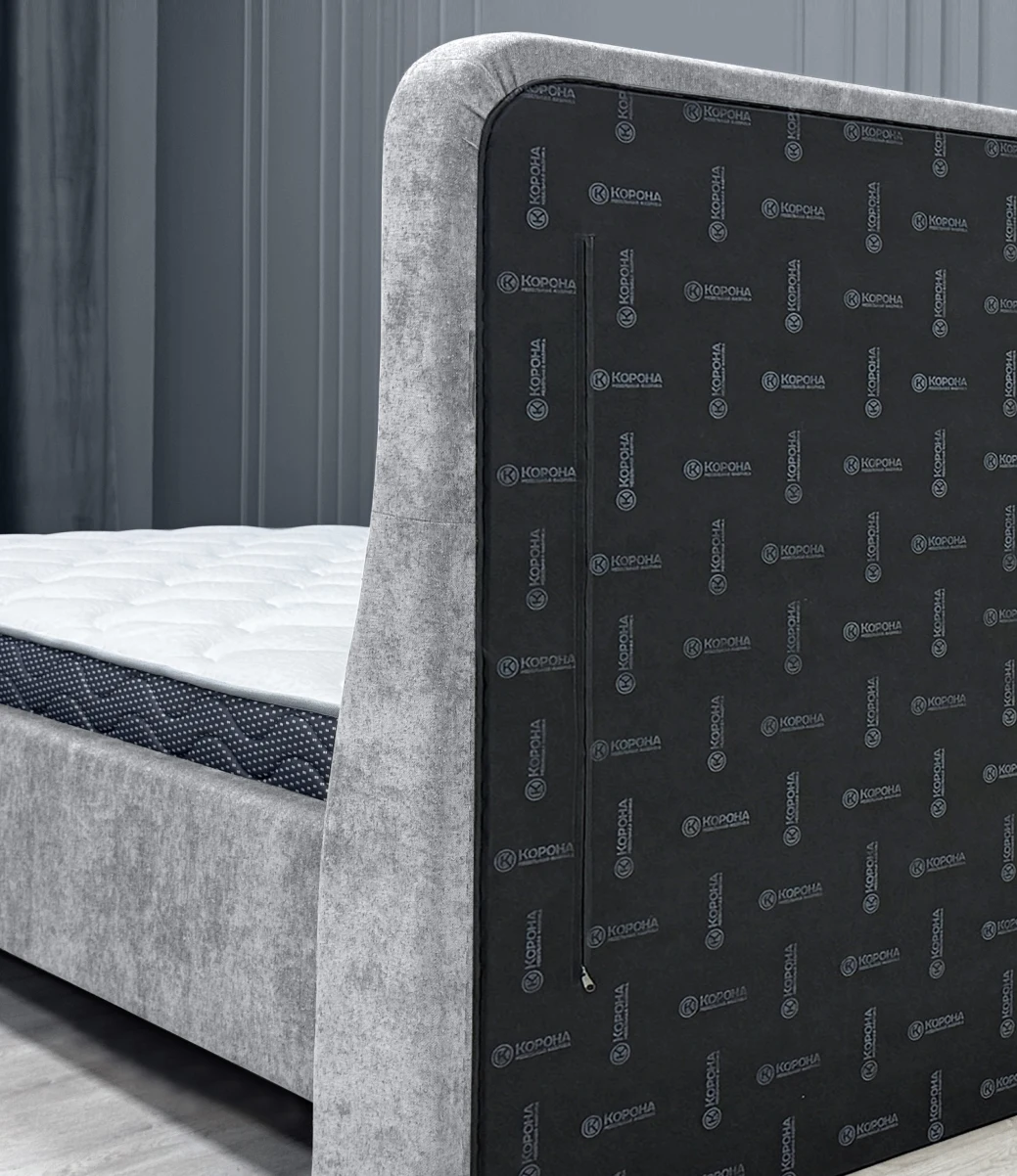 Дизайн изголовья формируется из округлой рамки и отдельных вертикальных вставок, которые изготавливаются и обтягиваются отдельно. Благодаря такому сочетанию все элементы изголовья имеют ярко выраженную выпуклую форму, что придает кровати премиальный внешний вид. Объемные мягкое изголовье
