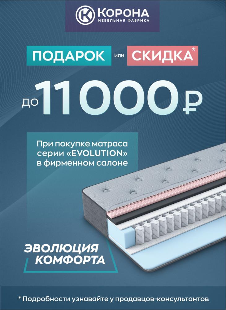 При покупке матраса из серии «Evoluiton» действует акция: подарки до 11 000 р. или скидка на следующий товар ТМ «Корона» в этом же чеке с 01.12.2025 по 31.01.2026г.