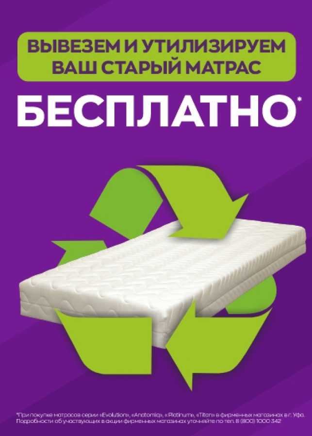 При покупке матраса из серий Platinum, Evolution, Anatomiq или Titan вы получаете бесплатную утилизацию вашего старого матраса!